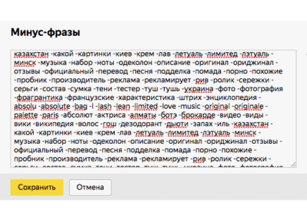 - Создаем и регулярно обновляем список минус‑слов (аккаунт/кампания/группа).